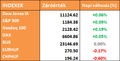 Emellett a kínai feldolgozóipari PMI is túlszárnyalta az elemzői várakozásokat és ez is növelte a piaci szereplők kockázatvállalási hajlandóságát, főként az árupiaci termékek iránt. Ugyanakkor a kereskedés nagy részében mégis negatív irányba mozogtak a részvények annak a hírnek is köszönhetően, hogy a JP Morgan (-0.56%) ellen vizsgálat indul egy 1.1 milliárd dolláros subprime ügylettel kapcsolatban. De a zárásra felhúzták a piacokat, így enyhe pluszban tudtak végezni a mutatók, melyek közül a Nasdaq 100 volt a felülteljesítő.