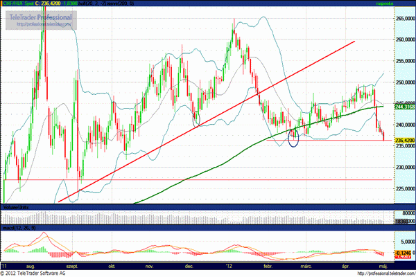 A tavaly áprilisban megindult emelkedő trendvonalat már január végén letörte az árfolyam, azonban a 200 napos mozgóátlag, mint támasz egészen a múlt hétig kitartott.