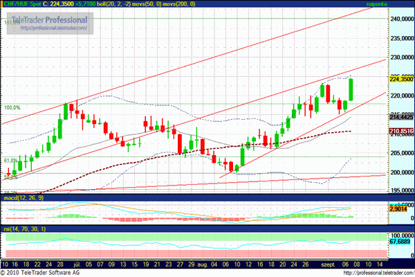 A borongós piaci hangulat nyomán a tegnapi napon is folytatódott a forintra nehezedő nyomás. A forint árfolyama veszített értékéből, azonban az európai bankrendszer, illetve szélesebb értelemben a pénzügyi stabilitás miatti aggodalmak tovább rontották a pozícióját. Délutánra már teljesen eltűnt a forint múlt hét második felében megszerzett előnye, sőt a svájci frankkal szemben új mélypont született. Az eladói nyomást csak fokozta, hogy a pénteken még pluszban záró amerikai piacok is veszteséggel kezdték a hetet (és veszteséggel is zártak), a hétfői kereskedési szünnap után. A frank jegyzése 16:00 óra után percekkel átlépte a múlt héten beállított 223,31 forintos rekord szintet, és egészen 224-ig emelkedett.
