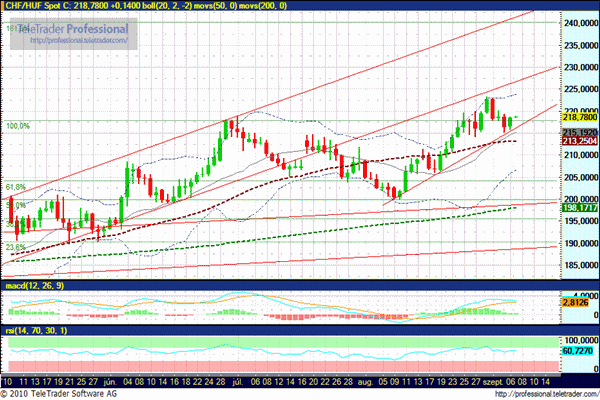 Ma még oldalazhat a CHF/HUF jegyzés, de várhatóan a hét folyamán megint emelkedésnek indul, és megpróbálkozhat visszakerülni a korábbi emelkedő sávba. Csökkenés során támasz 217,60 és 216 forintnál. Emelkedés során ellenállás 220,20 valamint 223,31 forintnál.