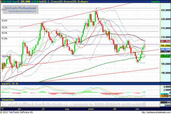 Az ellenállási szintet erősítheti az 50 napos mozgóátlag is, éppen ezért az elmúlt másfél hétben tapasztalt CHF/HUF árfolyam erősödést konszolidáció követheti. Csökkenésben támasz 203,50 forintnál. Amíg az ellenállási szintek alatt tud maradni, addig van esély a forint ismételt erősödésére.