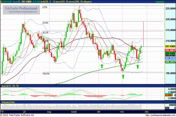 A grafikon alapján nem sok jóval szolgálhatunk a devizahitelesek, ezen belül a frankhitelesek számára, ugyanis a 207,50 forintos nyakvonallal egy fordított fej-váll alakzat formálódott.