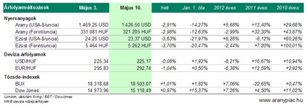 A londoni árfixingben április közepén elért 1.380 dolláros mélypontjáról visszaemelkedett az arany árfolyama az 1.483 dolláros ellenállás közelébe. Miután innét már nem volt tovább folytatás az előretörésben, most ismét a csökkenő tendencia érvényesül. Ennek során visszakerülhet a kurzus 1.400 dollár alá és tesztelheti újra az ez évi mélypontját. Amennyiben az ottani támaszszint nem bírná a terhelést és elesne, újult dinamikával szabadulhatna el az eladói nyomás a New York-i azonnali jegyzésben már látott 1.320 dolláros szintig. Ennél mélyebb tartománnyal egyelőre nem indokolt számolni, mert az elmúlt hetekben megmutatkozott vételi erő okot ad a bizalomra, hogy ennél lejjebb most azért nem kerülne az árfolyam. Ugyanakkor 1.450 dollár fölé visszatérve folytatódhatna még egy ideig az oldalazás 1.470-1.480 dollár körül, sőt átmenetileg akár 1.500 dollár fölé is elszökhetne a jegyzés, ahonnét azonban szinte biztos, hogy most még lepattanna.
