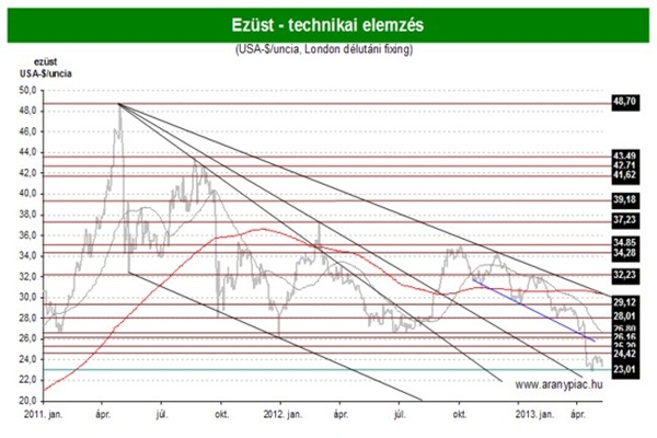 Az ezüst a 23 dolláros mélypontjáról emelkedett vissza 24 dollár fölé Londonban. Ennek során jóval erőtlenebbül viselkedett, mint a nagytestvér arany. Most küszöbön áll a 23 dolláros árszintnél húzódó támasz újbóli tesztelése, amely ha átszakad, megnyithatja az utat 22 dollár alá is.