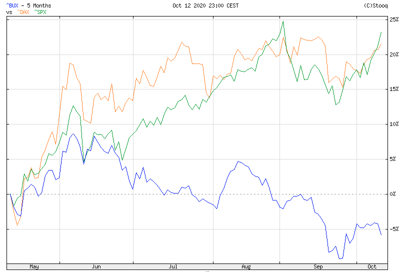 A BUX (kék) a német DAX (sárga) és az amerikai S&P500 index (zöld) mozgása