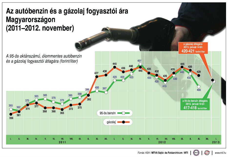 A 95-ös benzin literenkénti átlagára 417-418 forintra nő, a gázolajé 420-421 forint marad. A múlt héten a Mol bruttó 5-5 forinttal emelte a benzin és a gázolaj árát. A benzin ára tavaly április elején érte el csúcsát, akkor egy liter átlagosan 451 forintba került. A gázolaj 2012. január közepén volt a legdrágább, akkor egy liter ára átlagosan 449 forint volt. Az autósok 20-25 forintos árkülönbséget is tapasztalhatnak a kutaknál.