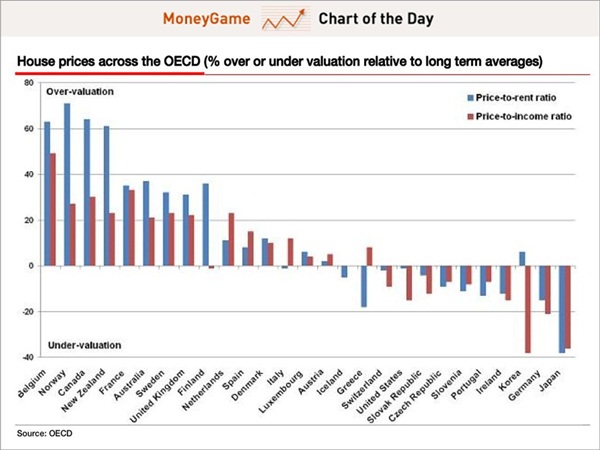 Meglepő, hogy az Egyesült Királyságban az ingatlanárak még mindig szélsőségesen magasak, annak ellenére, hogy a szigetország a globális hitelválság epicentrumában található, miközben a magánszektor fuldoklik az adósságokban” – kommentálta Albert Edwards, a Société Générale stratégiája az OECD megállapításait. Ugyanakkor figyelemreméltó, hogy a Ciprushoz hasonló hitelvihar előtt álló országokban, mint Írországban és Portugáliában mennyire olcsók az ingatlanok. Ám mégis talán az a meghökkentőbb, hogy az USÁ-ban milyen alacsony áron lehet ingatlanhoz jutni.