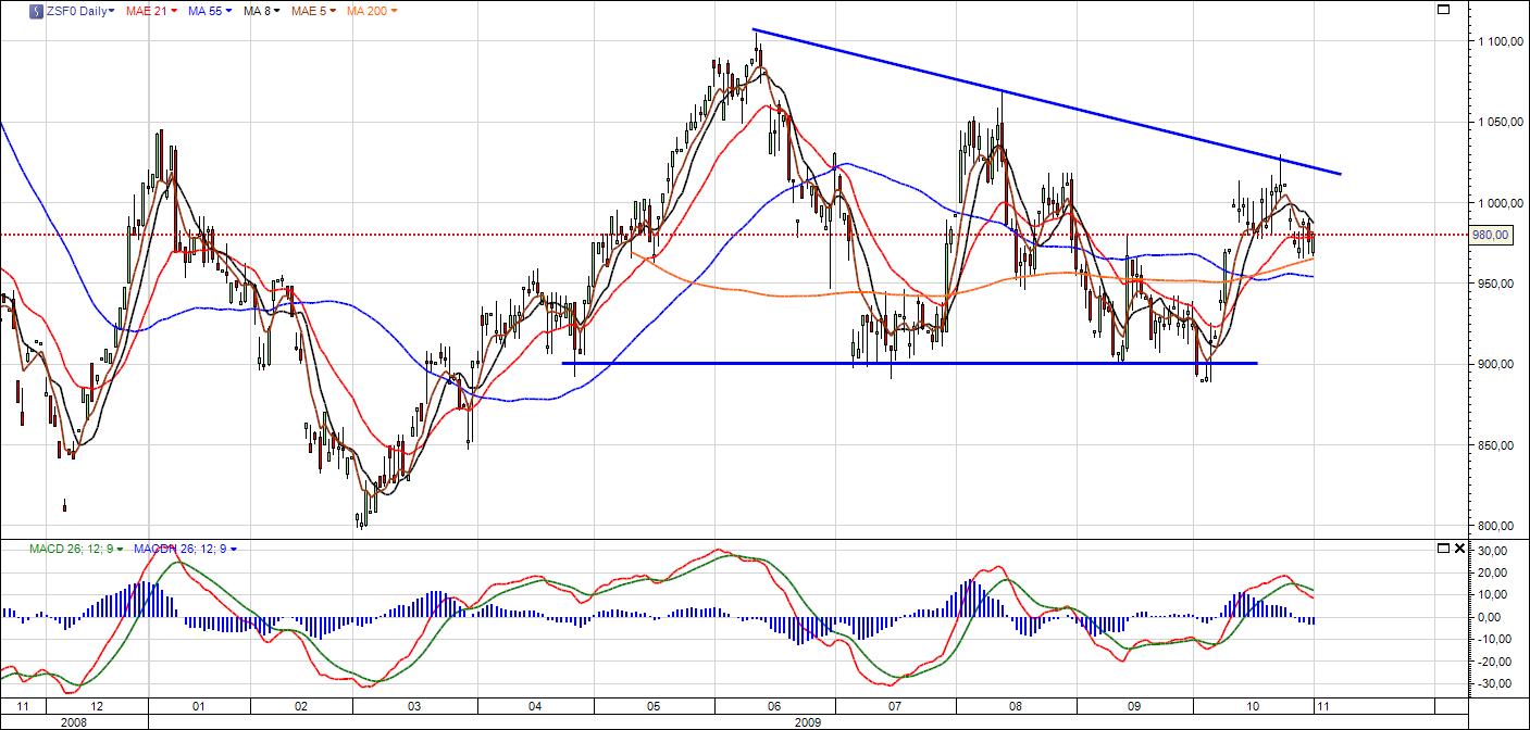 Jelenleg a 200 napos mozgóátlag támaszként szolgálhat az árfolyam számara, de amennyiben folytatódni fog az aratási folyamat és az időjárási kondíciók sem változnak az előrejelzetthez képest, elképzelhetővé válik, hogy újra tesztelni fogja a mozgóátlagot. Továbbá benézhet az átlag alá és ott a kerek számok, valamint az 55 napos mozgóátlag 9,5$ környékén szolgálhat támaszként. Ellenállást jelenthet a folyamatosan csökkenő trendvonal. (Solar Capital)
