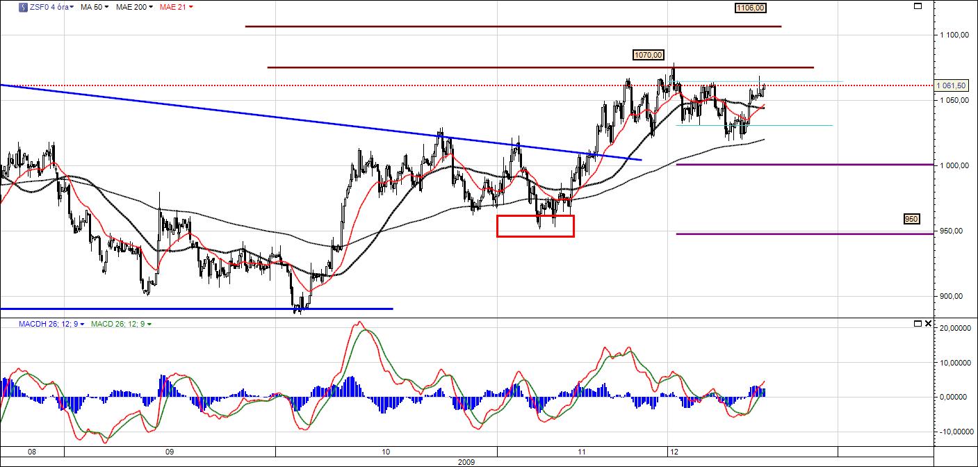 Az elmúlt héten megtesztelte az 1070-es szintet, ami jó ellenállásnak bizonyult és az óta konszolidálódik az árfolyam, ami inkább erőgyűjtésnek bizonyul. Az 1050 környéki szinteknél talált támaszt a konszolidációban és újabb nekirugaszkodáshoz készülődik. A világos kékkel behúzott sávban való mozgás lehet az a szakasz ahol nem érdemes beszállókat keresnünk. Amennyiben elhagyja, ezt a sávot lehet keresgélni a jó beszállási pontokat. Azt azonban szeretnénk javasolni, hogy a legbiztonságosabb az lenne, ha az 1070-es szint fölött lépnénk pozícióba. Alulról rövidebb távon jó támaszt biztosíthat a 21 napos mozgóátlag.