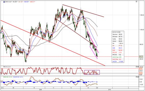 A szója továbbra is folytatja a már elgyengülőben lévő esését és ami korábban egy csökkenő ék alakzatnak látszódott, most már egy csökkenő trendcsatorna. Nem kizárt, hogy egészen a pirossal jelölt trendvonalig visszajöhet az árfolyam, ami 980-as értéket jelentheti. (Solar Capital)