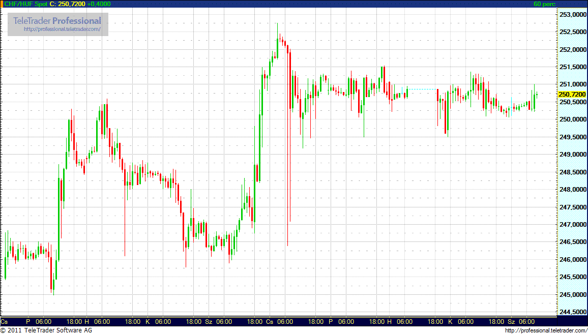 A svájci frank jegyzése szerdán délelőtt 250,84 forint a kedd esti 250,73 forinttal szemben, a dollárt 234,34 forinton jegyzik 234,21 forint után, a japán jen árfolyama 3,0147 forint a kedd esti 3,0093 forinttal szemben.