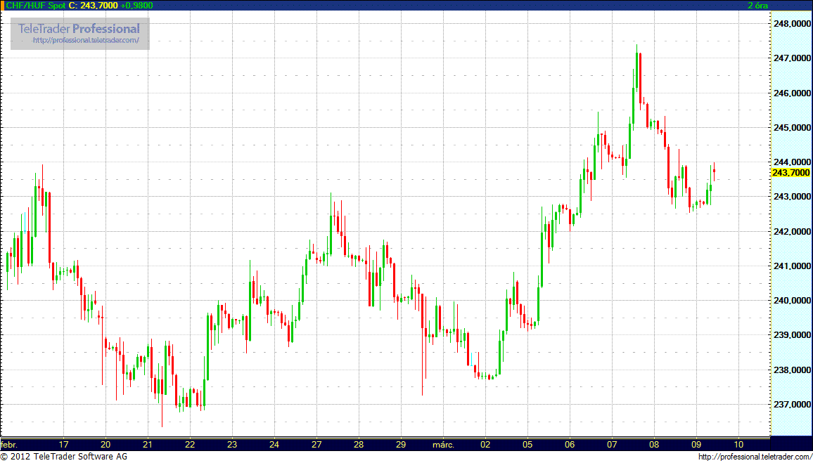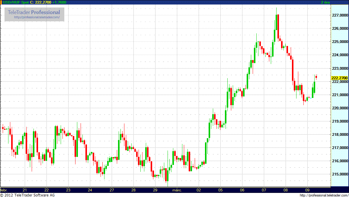 Csütörtökön a forint viszont már erősödött a görög kötvénycsere sikeres lezárásában bízó piaci környezetben, továbbá az EU/IMF-megállapodás mielőbbi megkezdésére és gyors lezárására tett magyar elkötelezettségnek köszönhetően. A forint árfolyama az elmúlt hét eleje óta pontosan követte az euró/dollár árfolyam mozgását, amely nagy pontossággal tükrözte a nemzetközi befektetői kockázatvállalás alakulását.