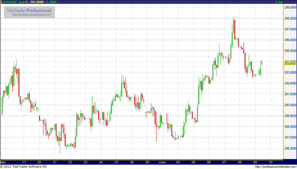 Szerdán a forint egészen 297,36-os euró jegyzésig gyengült a görög adósságcserét megelőző aggodalmak miatt a nemzetközi piacokon kialakult befektetői kockázatkerülés, illetve a magyar EU/IMF készenléti elővigyázatossági hitelkeretről folyó tárgyalások elhúzódását valószínűsítő piaci vélemények miatt.