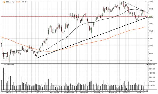 Fontos pontra érkezett az Adidas árfolyama! Nincs kizárva, hogy az elkövetkezendő napokban nagyobb elmozdulásokat láthatunk a sportszergyártó árfolyamában.
