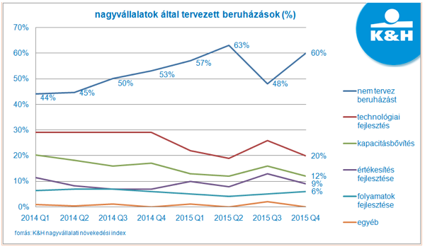 „Az elmúlt negyedév kiugró pozitív eredménye után visszakorrigált a beruházási szándék, így jelenleg tízből csupán négy hazai nagyvállalat tervez fejlesztést idén. A cégek leginkább technológiafejlesztésben és kapacitásbővítésben gondolkodnak, de mindkét esetben csökkent azoknak a vállalatoknak az aránya, akik ilyen irányú fejlesztésben gondolkodnak” - tájékoztatott a nagyvállalatok tervezett beruházási tevékenységéről Peter Roebben, a K&H vállalati üzletágának vezetője.
