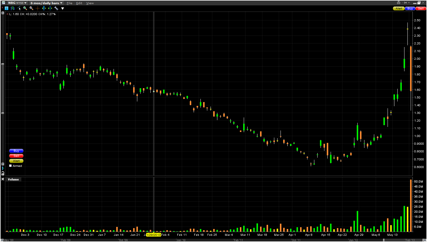 A tegnapi napon új részvényopciós hónap indult az NBG papírokra, és egy érdekességre lettek figyelmesek a szemfülesek. 1,5 dolláros strike áron a put opciók 40 dollárcentes prémium mellett forogtak. (Egy részvényopció 100 darab részvényre vonatkozik, tehát egyetlen opcióval valójában 40 dollárért kereskedhettünk).