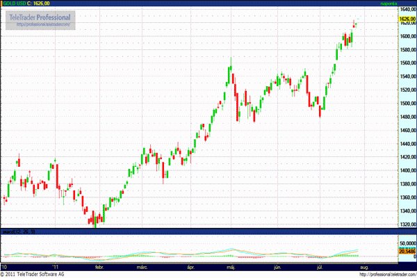Kedden az augusztusi szállítású kontraktus 4,60 dollárral 1.616,80 dolllára emelkedett unciánként a Nymex Comex divíziójában. A decemberi kontraktus 4,90 dollárral 1.619,30 dollárig erősödött. Elemzői várakozások szerint az arany árfolyama az adósságplafonról szóló viták lezárásáig tovább sodródhat felfelé, azonban a megegyezést követően minden bizonnyal korrekció indul, amely közel 20-40 dolláros esést is jelenthet.