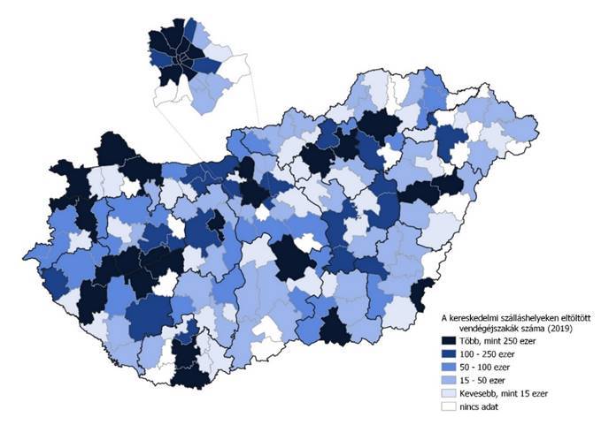 2. térkép. A kereskedelmi szálláshelyeken eltöltött vendégéjszakák száma (Forrás: KSH, Takarék Index grafika)