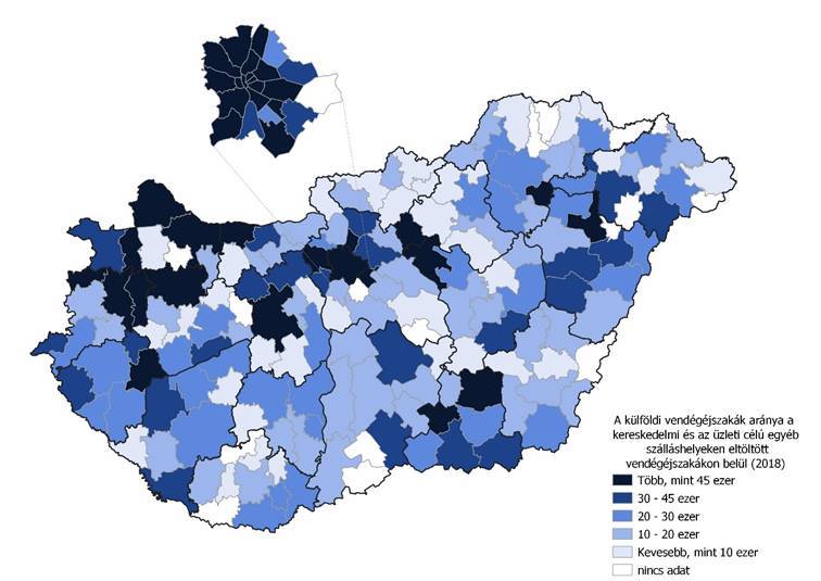 3. térkép. Külföldivendég-éjszakák aránya a kereskedelmi és az egyéb üzleti célú szálláshelyeken eltöltött vendégéjszakákon belül, járásonként (Forrás: KSH, Takarék Index grafika)