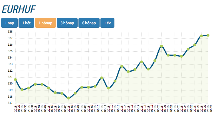 Az EUR/HUF árfolyam alakulása az elmúlt 1 hónapban