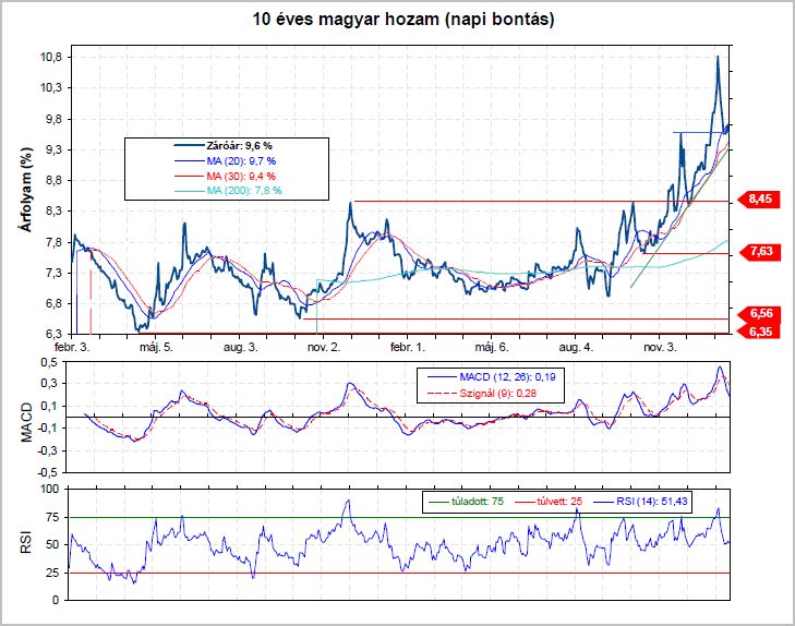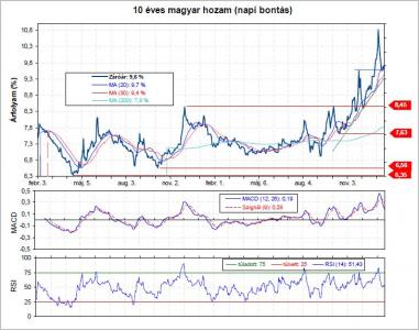 Ha kitart a jó hangulat a 10 éves hozam piacán, akkor folytatódhat az év eleje óta látható lejtmenet, és a 8,45%-os szintet is megérintheti a ráta . Ne feledjük azonban, hogy a jelenlegi volatilis piaci környezetben bármikor jöhet hirtelen fordulhat, és ebben az esetben újra a hosszútávú (emelkedő) trend irányába fordulhat a kurzus.