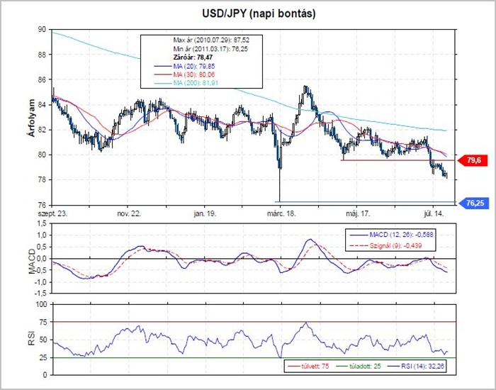 A japán jen sokat erősödött az elmúlt hetekben a dollárral szemben. Az árfolyam egy oldalazó szakasz után 81 környékéről lefelé vette az irányt, majd pár nappal később már a 79,6-os támasz alá került a devizapár. A grafikonon csökkenő trend látható, ezért nagyobb a valószínűsége a további jenerősödésnek. A következő támasz 76,25-nél található - olvasható az Erste elemzésében.