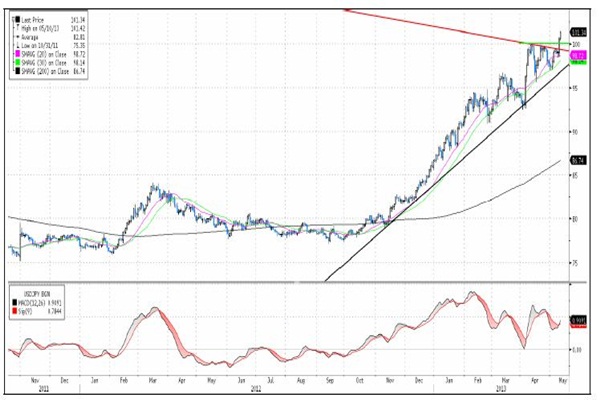 Az elmúlt napok jelentős emelkedése lehetővé teszi, hogy a stop-loss megbízásunkat feljebb húzzuk a 100-as támaszszint alá, 99,8-as árfolyamhoz. Rövidtávú célárukat 104-es árfolyamnál határozzuk meg, de hosszabb távra előretekintve meglátásunk szerint 2014 végére akár 124-ig is gyengülhet a jen árfolyama a dollárhoz szemben.