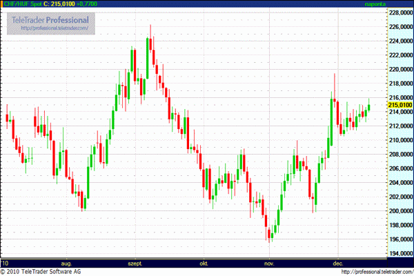 A svájci frank továbbra is rendkívül erősen tartja magát az euróval szemben, ennek hatására a forinttal szembeni jegyzése 216 forint közelébe emelkedett délelőtt, délutánra viszont 214,96 forintra mérséklődött. Kedden délután 213,45 forinton jegyezték a svájci devizát. A kereskedők szerint az erősödő trendben rövid távon nem várható változás. A frankhiteleseknek az kedvezhetne, ha az euró magához térne, ehhez pedig az kellene, hogy enyhüljön az eurózóna adósságproblémákkal küzdő országainak helyzete.