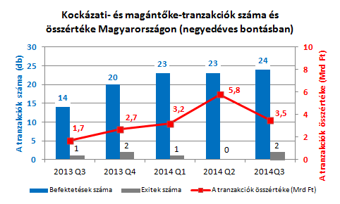 2014 júliusa és szeptembere között összesen 24 befektetési tranzakciót zártak Magyarországon a kockázatitőke-alapok. Az időszak során nagyobb méretű, magántőke (private equity) alapok által végrehajtott befektetésre nem került sor. Azonban két exit is megvalósult a harmadik negyedévben: mindkét esetben a menedzsment vásárolta ki a kockázatitőke-befektetőt.