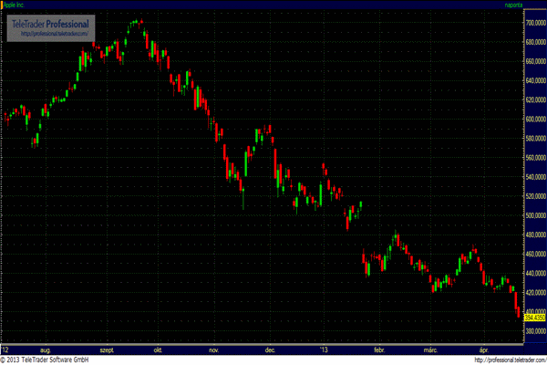 Az Apple jegyzése 1,65 százalékos csökkenésnél jár, miután a BMO Capital a korábbi 580 dolláról 460 dollárra csökkentette a részvényre vonatkozó célárát. Ugyancsak célárcsökkentést hajtott végre Janney Capital is, aki a vállalat fair érték a korábbi 610 dollárról 520 dollárra módosította. Az Apple árfolyama kezdetben emelkedést mutatott, miután a Verzion Communicatios arról számolt be, hogy az első negyedévben 4 millió iPhone készüléket aktivált, a Verzion árfolyama egyébként 4,20 százalékos emelkedésnél jár.