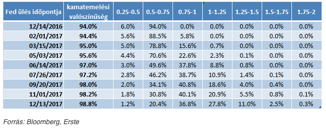 A decemberi kamatemelés esélyét már 94%-ra árazza a piac. Ennyire nagy valószínűséget eddig még egyszer sem láthattunk. A növekvő inflációs várakozáson és a várhatóan növekvő költségvetési hiányon túl a munkaerőpiac jó állapota is indokolja a kamatemelési várakozások növekedését. A szigorodó amerikai jegybanki kondíciók pedig előbb vagy utóbb az EKB részéről is változásokat kényszeríthet majd ki.