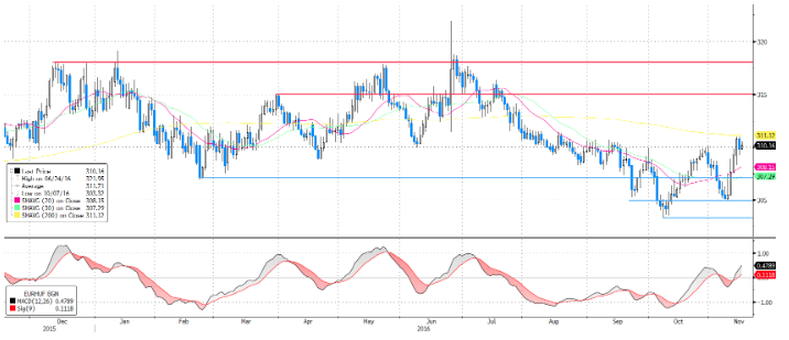 A veszteséglimitáló stop-loss megbízást a 20 napos mozgóátlag alá 307,4-hez javasoljuk elhelyezni. A kiszállási pontunkat pedig 315,1-hez helyezzük el. Így a hozam kockázat aránya közelíti a kettő az egyhez arányt.