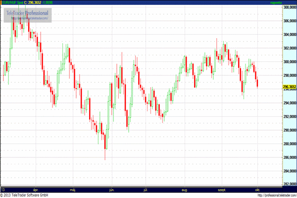 A kormányzati optimizmus a ma reggeli PMI indexen is látszik, az 54,5-es adat jelentős növekedés a múlt havi 51,7-es érték után. A 297-es szint alatt lehet egy kisebb megálló, de ha kitart a lendület, akkor akár a Fed utáni, 295-ös szintekig is erősödhet a hazai deviza.