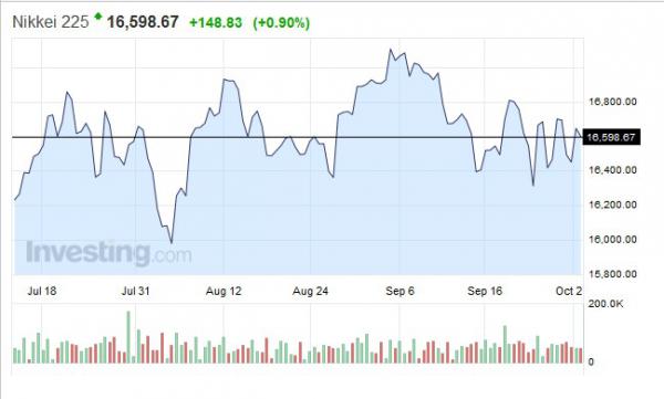 Tokióban, a térség más tőzsdéihez hasonlóan, elsősorban a pénzügyi részvények drágultak, miután múlni látszik a Deutsche Bank körüli bizonytalanság.
