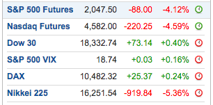 A 30 vezető amerikai iparvállalat DJIA-mutatója 3,52 százalékos, a tőzsdén jegyzett legnagyobb amerikai részvénytársaságok Standard & Poor's 500-as mutatója 4,31 százalékos, a technológiai részvények Nasdaq Composite mutatója pedig 4,69 százalékos mínuszban áll, míg a londoni tőzsde fő mutatója, az FTSE-100 index 4,09 százalékos, a frankfurti DAX-30 pedig 4,47 százalék körüli veszteségben indíthatja a kereskedést.
