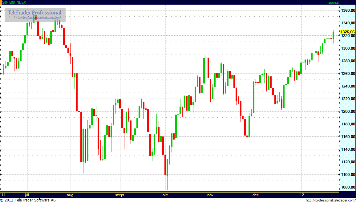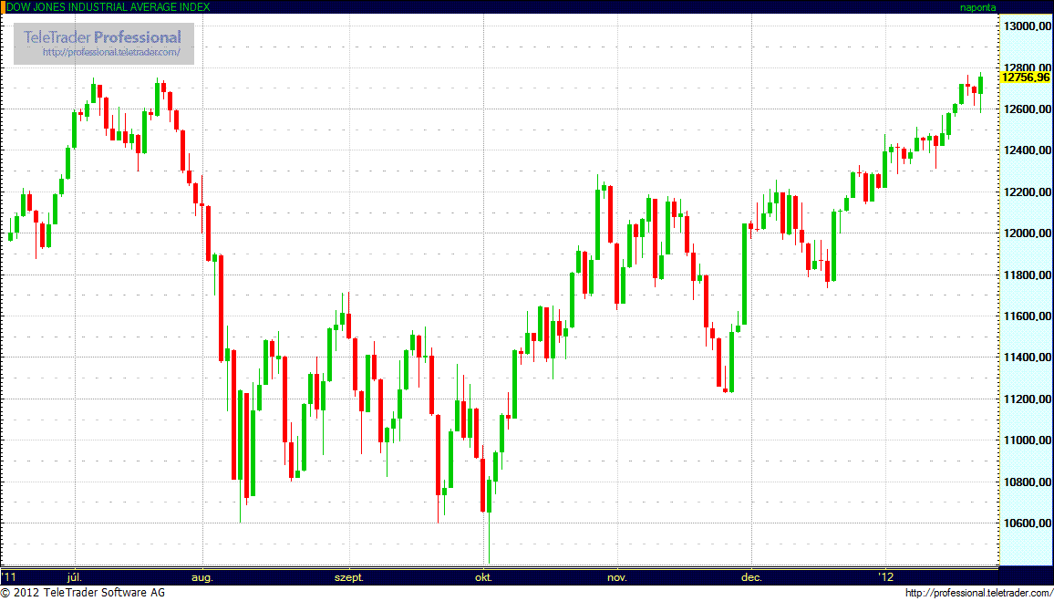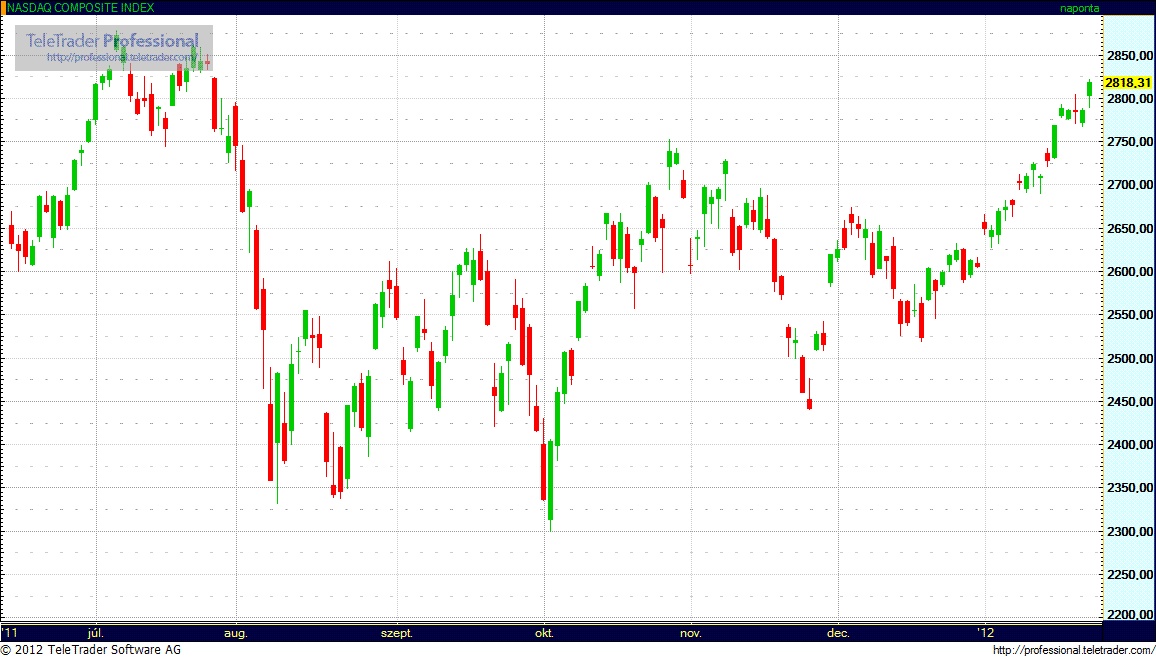 A Nasdaq továbbra is felülteéjesítő, az indexen belül legnagyobb mértékben a CA szoftvergyártó vállalat és az Apple emelkedett, a vártnál jobb negyedéves eredményeknek köszönhetően. Az Apple árfolyama 6,24 százalékos nyereségben zárt, miután a cég minden idők legjobb negyedévét zárta decemberben, köszönhetően annak, hogy okostelefonjából (iPhone) és táblagépéből (iPad) rekordmennyiséget értékesített az ünnepi szezonban.