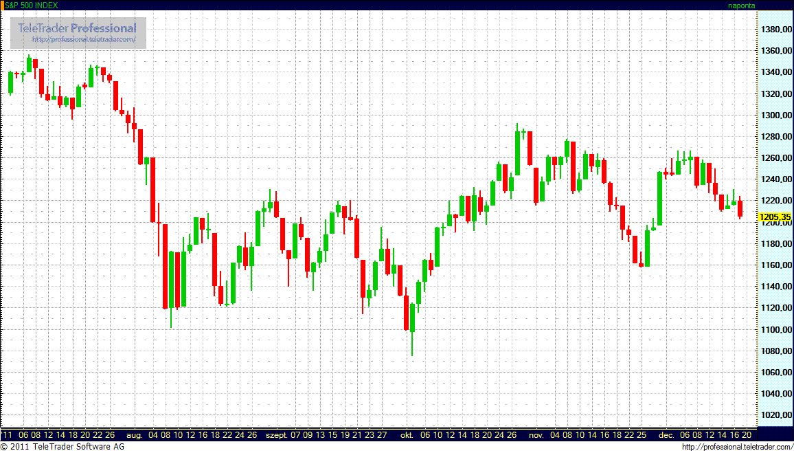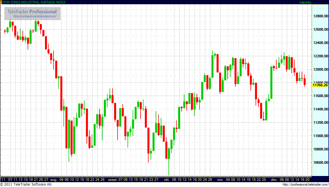 A DJIA index 99,9 ponttal, azaz 0,84 százalékkal 11.766,49 pontra csökkent. Az S&P 500-as mutató 14,31 ponttal, azaz 1,17 százalékkal 1.205,35 pontra esett. A technológiai részvények Nasdaq Composite mutatója 32,19 ponttal, vagyis 1,26 százalékkal csökkent és 2.523,14 ponton zárt.