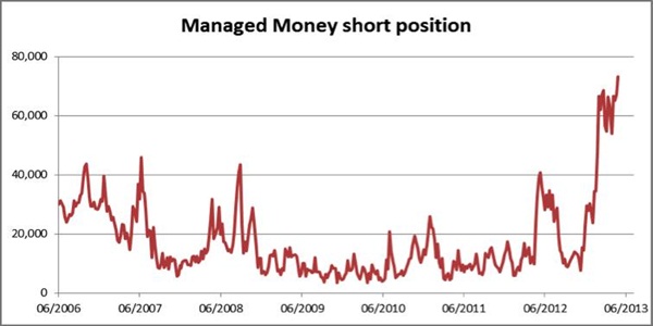 Az arany szélsőséges túladottságát jelzi a rá vonatkozó short pozíciók extrém mértéke