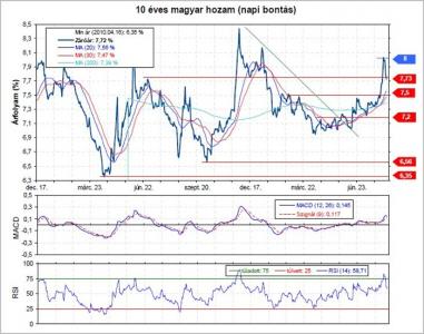 Ha folytatódik a csökkenés, akkor a 7,5%-os megállóig csökkenhet a ráta. A korrekciót azonban bármikor újabb pánik követheti, ezért egyelőre trendfordulóra nem számítunk, ha ismét emelkedni kezd a hozam, akkor gyorsan 8% fölé emelkedhet.
