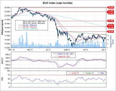 A hazai piac eséssel indította az újévet. Az emelkedő trendvonal törésével szembesülhettünk múlt héten, majd a 15.850 pontos korábbi lokális maximumot közelítette az árfolyam. Az elmúlt napokban azonban változott a hangulat, és újra lendületbe jött a BUX. A hét két első napja emelkedéssel telt, és kedden rés (16.668-16.729) kíséretében érte el a 20 és 30 napos mozgóátlagokat a kurzus. Itt megakadt az emelkedés, de a rés egyelőre akadályozza a nagyobb esést.