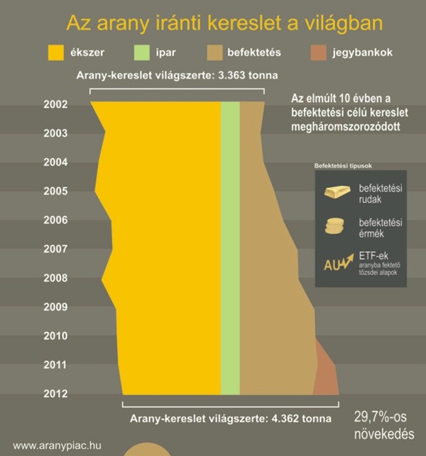 Ehhez képest az aranyár számos olyan tényező függvénye, amelyeknek nincs vagy csak alig van közük a reálgazdaság alakulásához. Bár az ipar is használ valamennyit a nemesfémből, például a mobiltelefonokban is megtalálható félvezetők gyártásához, más szegmensek mégis sokkal jobban dominálnak. Az Arany Világtanács adatgyűjtései arról árulkodnak, hogy a világ aranykeresletének a fele az ékszerpiac irányából érkezik, továbbá jelentős tétel még az arany tartalékeszközként történő alkalmazása.