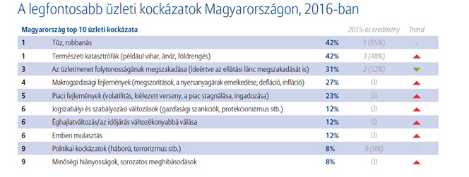 Idei évben kikerültek a top 10-es listából a hírnév és márkaérték romlásával kapcsolatos félelmek, s a válaszok alapján a cégek kevésbé tartanak a kiberbűnözéstől, valamint az egészségügyi problémákkal, járványokkal kapcsolatos kockázatoktól. A terrorizmussal kapcsolatos félelmek pedig ugyanolyan szinten maradtak.