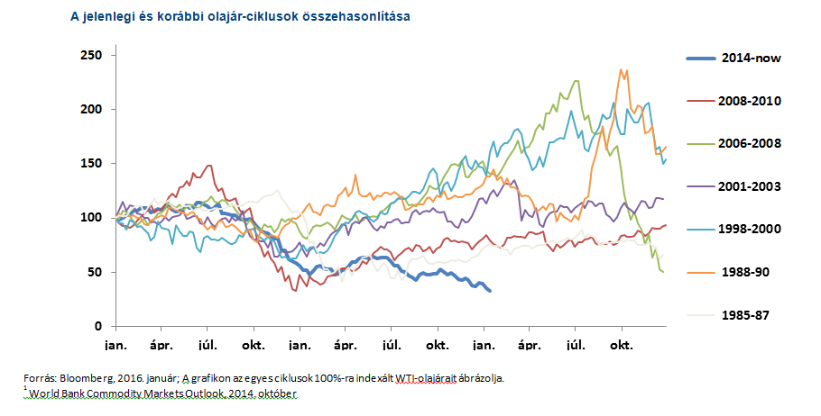 A kőolaj ára tavaly október vége óta kb. 30%-kal, június vége óta kb. 50%-kal, 30 dollár/hordó alá is csökkent – a beszakadás mértéke jó pár megfigyelőre meglepetésként hatott. A Világbank1 még 2014 októberében is 96 dollár/hordó árat jósolt 2015-re, ami csaknem 50%-kal magasabb volt, mint a ténylegesen megvalósult érték. Amint az alábbi grafikonon is látszik, az olajár jelenleg zajló beszakadása szinte minden korábbinál brutálisabb mértékű volt.