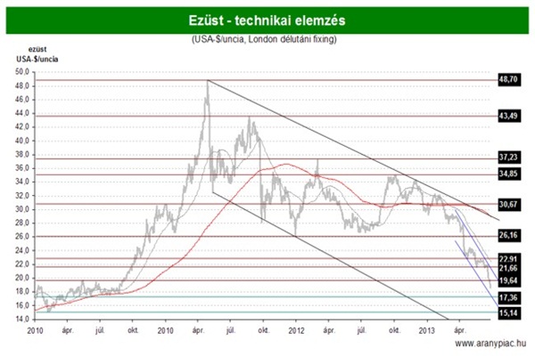Az arany grafikonja siralmas képet fest. Amennyire sietős volt egykor az útja felfelé, annyira tempósan száguld a kurzus most a mélybe, a mozgóátlagok alig győznek vele lépést tartani. Technikailag nem látszik semmiféle markáns támasz- vagy trendvonal, amelyen az árfolyam esése fennakadhatna, és ahol egy stabilabb aljat kiformálhatna. Az eddigi mélypontok mind átmenetinek bizonyultak, legfeljebb egy korrektív visszapattanásra tellett róluk, amely után ismét újabb mélységek következtek. A legvalószínűbb folytatás ezek után, hogy tovább tart a lejtmenet mindaddig, amíg a bikák ki nem véreznek. Hogy ez mikor következik be, arra előrejelzést adni szinte lehetetlen, de az eddig árfolyamesés projekciója akár 1.100 dolláros árszintet is elképzelhetővé tesz, sőt a pszichológiailag markáns 1.000 dollárra is érdemes felkészülni lelkiekben. Remény némi stabilizálódásra ugyanakkor csak 1.250 dollár feletti izmosabb megkapaszkodás esetén ébredhet.