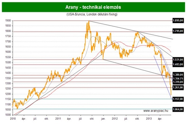 A Morgan Stanley befektetési bank egyelőre 1.487 dollárról 1.409-re vágta vissza az arany idei évre kalkulált átlagárát, de a banki elemzők 2014-ben is csak 1.313, 2015-ben pedig már csak 1.300 dollárral számolnak, ami ugyanakkor több mint ahol az árfolyam ebben a pillanatban áll. A Goldman Sachs ennél jóval pesszimistább, ott már az idei év végén 1.300-zal számolnak, míg 2014-re 1.050 dollárt várnak. Fő indoklásként a Fed mennyiségi lazításának a vártnál hamarabb történő kivezetését hozzák fel a szakértők, akik szerint ugyanakkor hosszabb távon 1.200 dollárnál már stabilizálódhat a szabadesés a bányák esetlegesen csökkenő kitermelése miatt.
