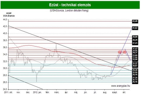Az ezüstnél nem sokkal 35 dollár alatt fulladt ki az augusztus-szeptemberi rally, egy dupla tető alakzat megjelenése után az emelkedő trend legtetején. Ezt megelőzően két horizontális szint között mozgott már egy ideje az ezüstár (33,85 és 34,85 dollár között), majd miután az alsó korlát átszakadt, az esés folytatódott. A mostani 32,33 dollárról légüres térben tovább zuhanva 31 dollár közelébe érkezhet meg az árfolyam, amíg újabb kapaszkodóra talál. Ide fut be hamarosan a 200-napos mozgóátlag görbéje is. Ennél messzebb egyelőre nem is érdemes az ezüst pályáját tovább gondolni. Most csak annyi látszik bizonyosnak, hogy egy újabb nagy emelkedés előtt még alapos tisztítótűzön kell átesnie az olcsóbbik nemesfémnek.