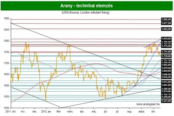 Általában is a kivárás jellemzi most a nemesfémek piacát. Az Egyesült Államokból valamelyest javuló makróadatokról érkeznek hírek, jóllehet a tőzsdei cégek harmadik negyedéves gyorsjelentései eddig jellemzően csökkenő eredményekről adtak számot. Az euróválság nem szolgál újdonságokkal, az éppen aktuális páciens Spanyolország ódzkodik pénzügyi segítséget igénybe venni, noha helyzete egyre kilátástalanabb. A többi súlyos adósságkórban szenvedőt, élükön a görögökkel, pedig életben tartja még az Unió pénzügyi lélegeztetőgépe. A brüsszeli politikacsinálóknak újra meg újra sikerül meggyőzni a közvéleményt arról, hogy az euró jövője megingathatatlan, amivel sikerül is a közösségi pénzzel szembeni illékony bizalomból rendre egy keveset visszanyerni. Mindez rövidtávon legalábbis megzabolázza az aranyárfolyamot.
