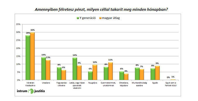 „Megtakarítás tekintetében az Y generáció tudatosabban viselkedik, mint a teljes magyar felnőtt lakosság, mivel a megkérdezettek fele tesz félre havonta valamekkora összeget, míg a teljes magyar lakosság esetén ez az arány 42%.” - emelte ki Felfalusi Péter, az Intrum Justitia Zrt. vezérigazgatója. A megtakarítás célja is eltérő a 20 és 35 év közötti fiatalok körében, ők ugyanis utazásra, lakásvásárlásra, illetve fogyasztási cikkekre nagyobb mértékben tesznek félre, mint a magyar átlag, azonban a nyugdíjra kevésbé gondolnak még. Nem meglepő az sem, hogy az Y generáció előnyben részesíti az online vásárlást, a 20 és 35 év közötti korosztály 41%-a rendszeresen vásárol az interneten keresztül, míg a magyar átlag 33%-a viselkedik hasonlóan.