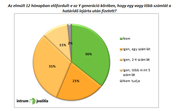 A felmérés azt mutatja, hogy a teljes magyar lakosság 63%-ával fordult elő az elmúlt 12 hónapban, hogy egy vagy több számláját nem tudta időben kifizetni, ami közel azonos az Y generáció (64%) számlafizetési moráljával. Az is kiderült, hogy amennyiben valaki csúszik a számlafizetéssel, akkor többnyire nem csak egy számlával marad el, hanem jellemzően 3-4 számlával is. Jó hír azonban, hogy a megkérdezettek csupán 2%-a nem tudta, hogy megcsúszott a fizetéssel, vagyis az Y generáció figyelemmel kíséri a számlafizetési határidőket.