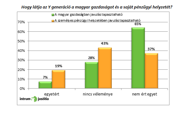 Az Y generáció és a magyar lakosság véleménye igen hasonló abban a kérdésben, hogy a magyar gazdaság javult-e az elmúlt időben. Az Y generációnak csupán 7%-a gondolja úgy, hogy javult a gazdasági helyzet, a teljes lakosságnak pedig a 8%-a vélekedik így. A fiatal felnőttek 28%-a nem nyilvánított véleményt, míg 65% szerint a gazdasági helyzet romlott hazánkban.